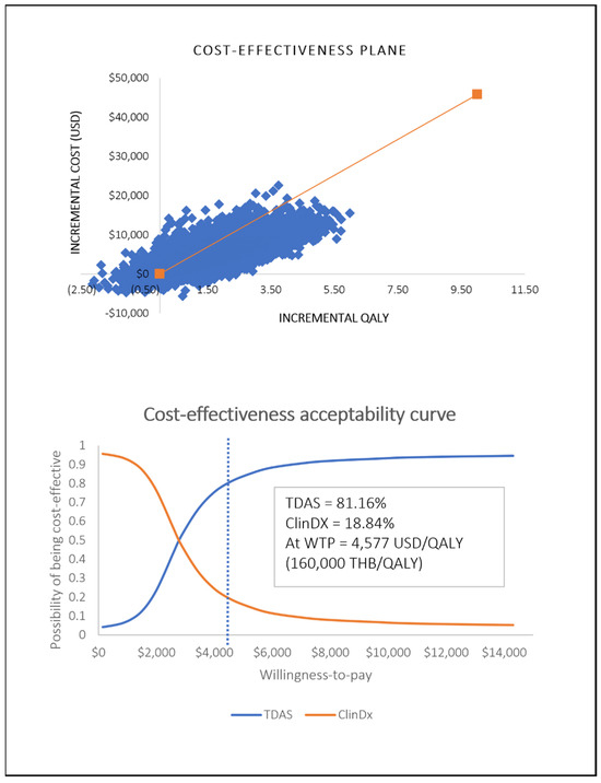 The willingness to pay (WTP) threshold was set at 160,000 Thai baht (THB)/QALY (4577 USD/QALY). This threshold was used as the benchmark to assess whether TDAS or ClinDx provide good value for money. The cost-effectiveness acceptability curve (CEAC) was generated by varying the WTP threshold. All costs expressed in THB were converted to USD using an exchange rate of 34.995 THB/QALY, according to a report for the Bank of Thailand on 18 December 2023. This conversion ensures that the economic evaluations are accessible and understandable in a global context.