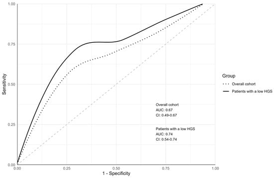 Upon ROC curve analysis, the AUC was 0.67 (95% confidence interval [CI]: 0.49–0.67) for the overall cohort and 0.74 (95% CI: 0.54–0.74) for patients with a low HGS (Figure 2). For the group with a lower HGS, the AUC was higher than that for the overall cohort. For both groups, the sensitivity, specificity, positive predictive value (PPV), and negative predictive value (NPV) of the JHFRAT were further assessed using the Youden index (Table 3). Among the overall cohort, the JHFRAT cutoff score yielding the maximal Youden index (0.35) was 11, and the sensitivity, specificity, PPV, and NPV at that score were 0.67, 0.68, 13%, and 97%, respectively. Among patients with a low HGS, the cutoff score yielding the maximal Youden index (0.47) was 12, and the sensitivity, specificity, PPV, and NPV at that score were 0.75, 0.72, 14%, and 98%, respectively.