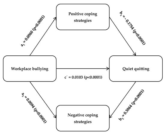 Table 5 shows the indirect impact of workplace bullying on quiet quitting through positive and negative coping strategies. Our mediation analysis showed that the indirect mediated effect of workplace bullying on quiet quitting through positive coping strategies was significant (b = −0.0011, 95% CI = −0.0017 to −0.0005, p < 0.0001). Workplace bullying was a significantly positive predictor of quiet quitting (b = 0.0128, 95% CI = 0.0109 to 0.0147, p < 0.0001). Workplace bullying was a significantly positive predictor of positive coping strategies (b = 0.0060, 95% CI = 0.0042 to 0.0078, p < 0.0001), while positive coping strategies were a significantly negative predictor of quiet quitting (b = −0.1754, 95% CI = −0.2574 to −0.0933, p < 0.0001). Additionally, workplace bullying was a significantly positive predictor of negative coping strategies (b = 0.0094, 95% CI = 0.0079 to 0.0110, p < 0.0001), while negative coping strategies were a significantly positive predictor of quiet quitting (b = 0.3864, 95% CI = 0.2891 to 0.4837, p < 0.0001). Moreover, the direct effect of workplace bullying on quiet quitting was still significant (b = 0.0103, 95% CI = 0.0082 to 0.0122, p < 0.0001) even after the mediating effect of positive and negative coping strategies. Positive and negative coping strategies partially mediated the relationship between workplace bullying and quiet quitting since the direct and indirect effects of workplace bullying were significant. Positive coping strategies caused partial competitive mediation, while negative coping strategies caused partial complementary mediation. In conclusion, our mediation analysis supported Hypothesis 2. Figure 2 presents the final mediation model.