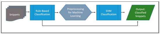 NLP tool pipeline operations. Raw snippets are first processed by the rule-based module, which sends the snippets it classifies to output. Snippets that are not classified by the rule-based module are preprocessed and used as input for the trained SVM model, which trains all the remaining snippets and sends them to output.