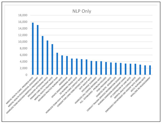 The most frequent documents for the NLP Only group (Figure 3) address unique issues like opioid prescribing and homelessness. Both charts include note types for substance abuse treatment (i.e., SATP, substance abuse treatment program; SARP, substance abuse rehabilitation program), but there are several in the NLP/ICD group (Figure 4). Both charts include several mental health-oriented notes, emergency department notes, and notes for other health issues (diabetes in the NLP Only group; eye clinic in the NLP/ICD group).