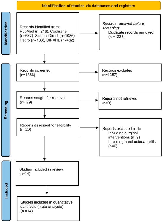 The main research identified 2624 records. After the removal of duplicates, 1386 records were considered relevant. Subsequent screening of titles and abstracts resulted in 29 eligible publications for full-text assessment. Fifteen studies did not satisfy the inclusion criteria and fourteen RCTs were finally included [19,20,21,22,23,24,25,26,27,28,29,30,31,32]. The flow chart of the study selection is presented in Figure 1.