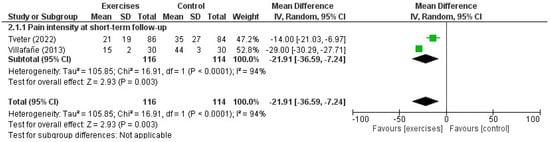Two RCTs [29,30] made an indirect comparison between exercises in addition to a multimodal therapy programme and a control intervention for thumb CMCJ OA. The maximum duration of follow-up was three months and the mean age of the participants (n = 240) was 67.8 years. There was a statistically and clinically significant difference in favour of exercises with manual therapy and orthoses compared with control interventions in pain intensity at short-term follow-up (MD: −21.91; 95% CI: −36.59, −7.24; p = 0.003, d = 0.93) (Supplementary Table S2). One RCT [29] evaluated wrist disability using the QuickDASH score and suggested statistically and clinically better outcomes in favour of exercises at short-term follow-up (MD: −8.1, 95% CI: −4.6, −11.5; p = 0.02, d = 0.51) (Supplementary Table S2). Two studies evaluated pinch strength suggesting no difference between the comparators at short-term follow-up (Supplementary Figure S1) [29,30]. A forest plot for the effectiveness of exercises in addition to a multimodal treatment programme compared with no treatment in pain intensity is shown in Figure 2.