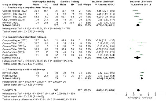Forest plot for the effectiveness of the use of proprioceptive training compared with standard treatment in pain intensity in patients with thumb carpometacarpal osteoarthritis [19,20,21,22,23,26,27].