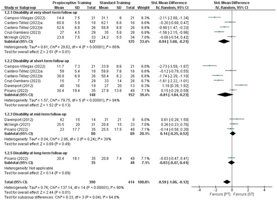 Two out of nine eligible studies did not report the mean values of the study groups and subsequently, were excluded from quantitative synthesis [24,25]. We found a statistically and clinically significant difference in favour of proprioceptive exercises compared with standard treatment in mean change in pain intensity at very short- (SMD: −0.76, 95% CI: −1.30, −0.21; p = 0.007, d = 0.52) and short-term (SMD: −0.93, 95% CI: −1.86, −0.00; p = 0.05, d = 0.54) follow-up (Supplementary Table S3). There was no difference between proprioceptive exercises and standard treatment in pain intensity at the mid- (SMD: 0.26, 95% CI: −0.04, 0.55; p = 0.09) and long-term (SMD: −0.05, 95% CI: −0.38, 0.49; p = 0.80) follow-up times. Although a statistically significant difference was found in favour of proprioceptive exercises in disability scores in the very short-term (SMD: −0.94, 95% CI: −1.68, −0.21; p = 0.01), no differences were observed at short- (SMD: −0.81, 95% CI: −1.84, 0.23; p= 0.13), mid- (SMD: −0.14, 95% CI: −0.25, 0.52; p = 0.49) and long-term follow-up (SMD: −0.03, 95% CI: −0.47, 0.41; p = 0.89) occasions (Supplementary Table S3, Figure 3 and Figure 4).