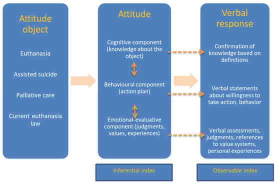 The survey of respondents’ attitudes was based on structural theory. An individual’s attitude towards some tangible or abstract object is a relatively permanent evaluation that values that object positively or negatively [26], which plays a mediating role between stimulus and response [27] and helps to predict and understand human behaviour [28]. Attitudes are complex structures from which many elements can be extracted. Three core components of attitude have been identified: a cognitive component, a behavioural component and an emotional component [29,30,31]. The existence or absence of particular components and the relationships between them can be useful in understanding more fully human attitudes, including the behaviour of individuals and social groups. The components of attitudes are difficult to observe and require an appropriate empirical approach. Individual responses to questions (verbal reactions) with cognitive, behavioural and emotional load were treated as observable consequences of hypothetical (inferential) attitude indicators (Figure 1). Indeed, it can be assumed that the key determinant of surveyed doctors’ and students’ behaviour will be their attitudes towards given practice, the latent form of which will be revealed through the behavioural, emotional and cognitive components observable in verbal responses.