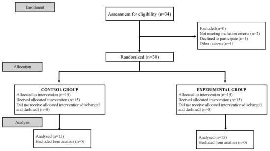 Patients who met the criteria were invited to participate in the study and were provided with a comprehensive information form detailing the potential risks and benefits of the trial and the procedures and interventions involved. Those who agreed to participate then signed the informed consent. Given the lack of studies regarding the effects of Pilates intervention on daily functioning in post-stroke patients, sample size calculations were carried out based on the findings regarding the effectiveness of a Pilates intervention on the quality of life of this population, as independent daily functioning is a main indicator of quality of life [2]. A sample size of n = 15 in each group was estimated to identify a previously reported effect size of 1.34 with a statistical power of >90% (α error < 0.05; β error < 0.90).