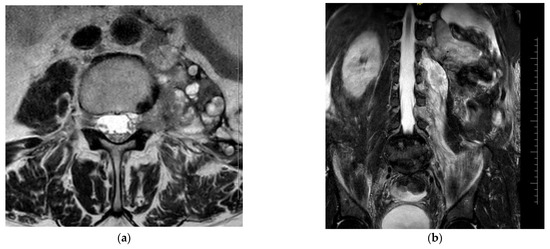 An imaging study (MRI of the lumbosacral spine) showed a 3.5 mm intradural lesion at Th 12 in the terminal part of the medullary cone on the left side—most likely a metastatic lesion. There was an extradural, paravertebral, and para-aortic conglomerate of lesions also involving the iliopsoas muscle and forming polycyclic masses extending for about 138 mm. These were lymph nodes and tumor metastases. At the L3–L4 level, there were visible metastases into the left intervertebral foramen with displacement and compression of the nerve roots. On the left side, there were spinal nerves among the conglomerate of the described lesions (Figure 1).