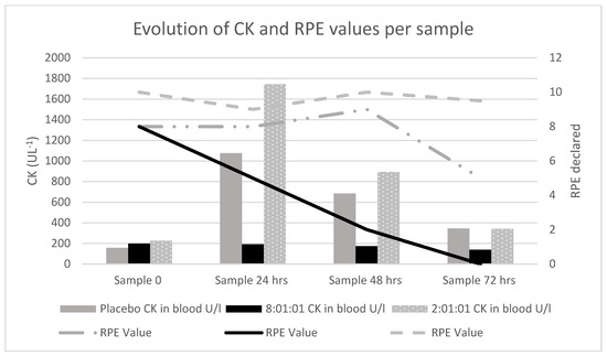 The results obtained show how the RPE and the CK values varied depending on the samples taken: CK values decreased from sample 0 and onwards, as did the RPE values, with the 8:1:1 preparation (Figure 1).