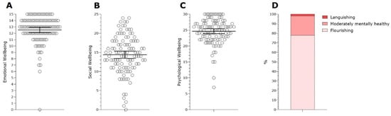 Scores distributions of emotional, social, and psychological well-being of all the participants. Scores distributions of MHC-SF factor scores of emotional, social, and psychological well-being of all the participants as well as a classification of flourishing and languishing mental health based on these scores. (A) Distribution of emotional wellbeing factor, which represents the positive effects of life satisfaction; (B) Distribution of social wellbeing factor, which represents connectivity and beliefs of affiliation to social groups; (C) Distribution of psychological well-being factor, which represents individual perception of personal growth and life purpose; (D) Classification of mental health indicator based on the subscales scores – presented in percentage. Data from (A–C) are presented in mean and standard deviation.