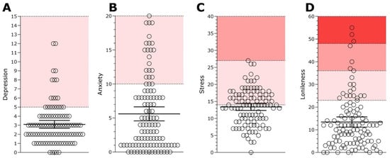 Score distributions of mental health indicators of the sample: depression (A), anxiety (B), stress (C), and loneliness (D). (A) (Depression): The white band represents participants without depressive symptoms (scores below 5), and the light red band indicates the presence of depressive symptoms (scores above 5). (B) (Anxiety): The white band indicates the absence of anxiety symptoms (scores below 10), and the light red band shows the presence of anxiety symptoms (scores above 10). (C) (Stress): The white band denotes the absence of significant stress symptoms (scores below 14). The light red band represents the presence of significant stress symptomatology (scores between 14 and 26), and the dark red band indicates severe stress symptoms (scores above 27). (D) (Loneliness): The bands represent increasing levels of loneliness, with white indicating minimal loneliness (scores from 0 to 22), followed by progressively darker shades of red for mild loneliness (23 to 35 points), moderate loneliness (36 to 47 points), and intense loneliness (48 to 60 points).