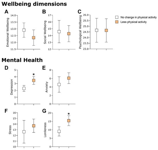 This figure illustrates the comparison between participants who did not change their physical activity levels and those who decreased them during the lockdown. (A–C) depict these groups in terms of wellbeing characteristics. (D–G) present comparisons of the same groups regarding mental health aspects such as depression, anxiety, stress, and loneliness. Significant differences were found only in depression (D) and loneliness (G), and are marked with an asterisk (*).