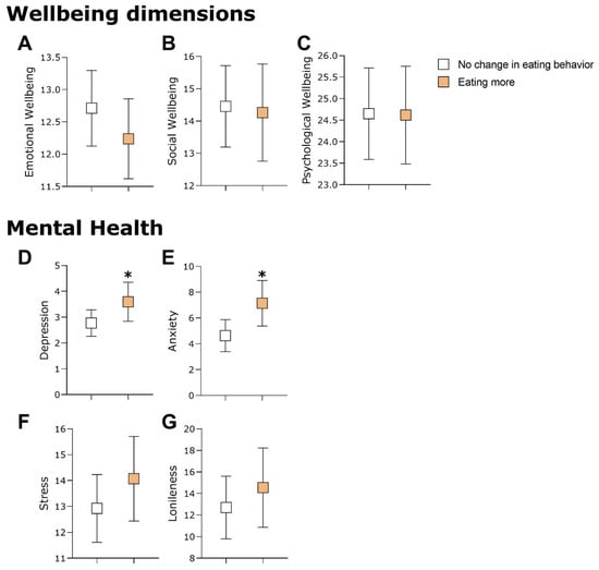 Comparison between participants who did not change their eating behaviors and those who increased them during the lockdown. (A–C) show groups comparisons in relation to emotional, social and psychological wellbeing, respectively. (D–G) present comparisons of mental health indicator of depression, anxiety, stress, and loneliness, respectively. Significant differences (p < 0.05) were found in both anxiety and depression indicated with an asterisk (*). Data are presented in mean and standard deviation.