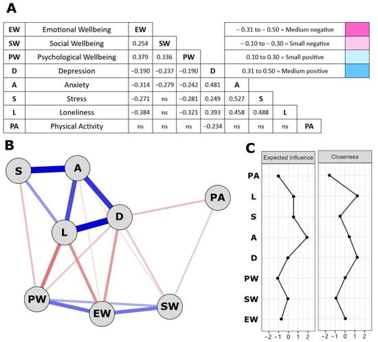 The associations between the well-being dimension, the mental health indicators, and the physical activity levels, as well as the results from the network analysis are presented in Figure 5. The well-being scores had small to medium positive correlation scores between them, and the mental health indicators had a significant positive correlation with the scores for depression, anxiety, and stress, with the exception of depression and stress which showed a nominal positive correlation. The well-being scores had small to medium negative associations with mental health indicators and loneliness, except for social well-being with stress and loneliness. There was a small negative correlation between physical activity and depression scores (Figure 5A).