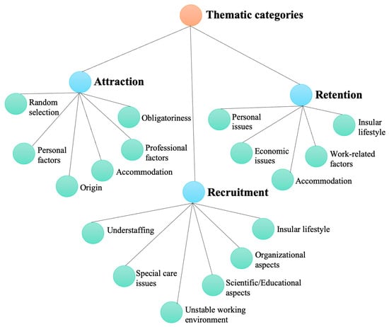 The analysis of the transcribed interviews revealed three thematic categories, with subcategories that influence the attraction, recruitment, and retention of healthcare professionals in primary healthcare facilities in rural island areas of Greece and are presented in Figure 1.