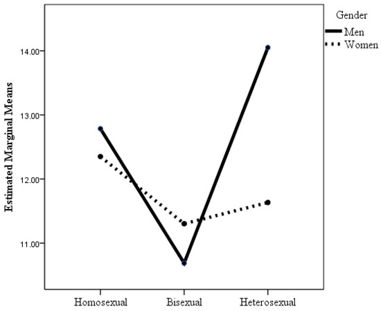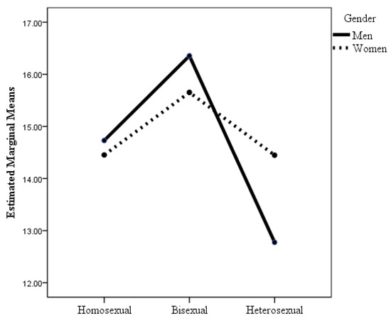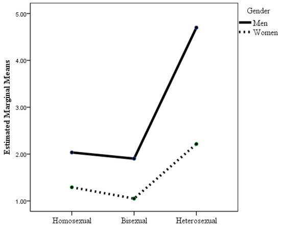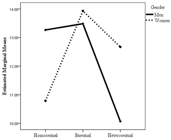 According to the ANOVA where the dependent variable was homonegativity, the interaction effect of sexual orientation × gender was statistically significant (see Table 2 and Figure 6), although the effect size was small. Post hoc analyses with Bonferroni adjustment revealed that there were statistically significant differences (p < 0.001) between heterosexual men and the other groups and between heterosexual women and bisexual women. Heterosexual men had greater homonegativity than did bisexual women and men, gay men, lesbian women, and heterosexual women. Although the homonegativity scores of heterosexual women were much lower than those of heterosexual men, their mean scores were somewhat higher than those of the other groups, although the differences were statistically significant only for bisexual women. It highlights that there were no statistically significant differences in homonegativity between homosexuals and bisexuals, although the mean scores of homosexual and bisexual men were slightly higher than those of homosexual and bisexual women.