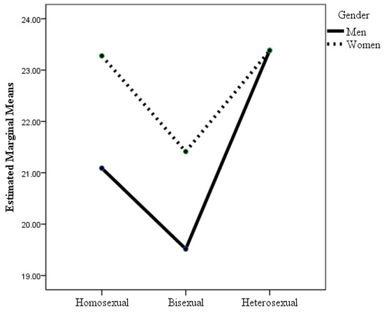 The analysis of the sexual orientation of the 747 people in the sexual minority group revealed that 200 of the men reported being gay, 93 men reported being bisexual, 137 of the women reported being lesbian, and 317 reported being bisexual. Table 2 shows the results of the ANOVAs in which the factors were sexual orientation and gender, and the dependent variables were the indicators of health and well-being considered in this study. When the dependent variable was psychological distress, the interaction effect of sexual orientation × gender was statistically significant (see Table 2 and Figure 1), although the effect size was small. Post hoc analyses with Bonferroni adjustment revealed statistically significant differences between heterosexual men and heterosexual women (p = 0.02), gay men (p = 0.03), and bisexual women and men (p < 0.001). As shown in Table 2 and Figure 1, heterosexual men had lower levels of psychological distress than the other groups, but the differences were not statistically significant (p = 0.29) with respect to lesbian women. It highlights that although the mean scores for psychological distress were quite similar for homosexual women and men and for bisexual women and men, and were even slightly higher for men than for women, the opposite was true for heterosexuals. Thus, heterosexual women had more psychological distress than heterosexual men, differences that were statistically significant. However, the mean psychological distress scores for heterosexual women were very similar to those for homosexual women and men, and slightly lower than those for bisexual women and men, although the differences were not statistically significant.