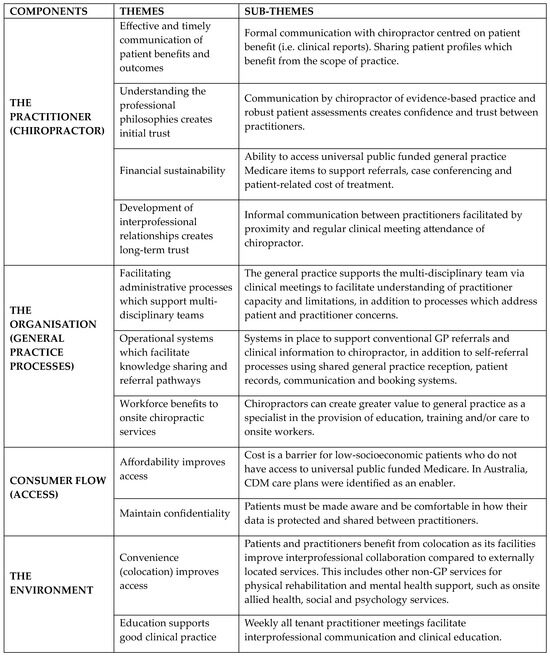 Respondents (n = 12) reported that their perception of chiropractic care as a treatment modality improved with a more positive view (n = 12) after interacting and/or referring to the collocated chiropractor. Some participants did not report a change in their views (n = 9) towards chiropractic care and remained positive (n = 4), negative (n = 4), or neutral (n = 1) towards the discipline. No participants developed increased negative views towards chiropractic care or its discipline after working together within the general medical practice. Positive communication of patient benefits associated with the delivery of chiropractic care in the centre (n = 18) were described as important by participants to enable initial and continuing referrals.