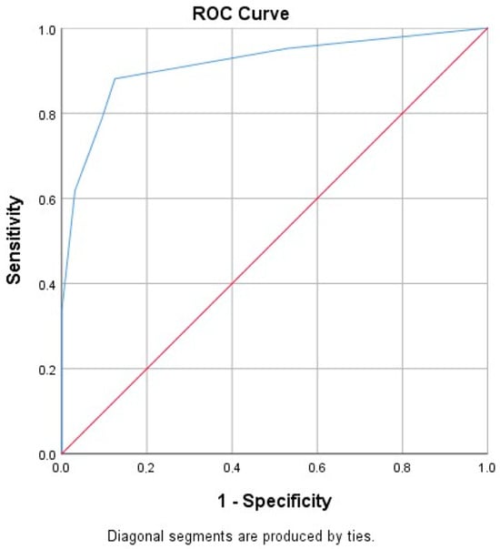 Using the SPPB test (1–9 score was categorized frail) as a reference (gold) standard, PRISMA 7 showed an excellent discrimination (AUC = 0.915, 95% CI = 0.848–0.981). A cut-off point of 2 or higher for PRISMA was applied and indicated a sensitivity of 88.1% and specificity of 99.9%, as presented in Figure 1.