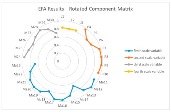 After applying a rotation transformation to increase interpretability, a rotated component matrix in factor analysis illustrates the link between the observable variables and the underlying factors. In our study, all items were imported correctly into the reference domain, meaning they accurately reflect the data from their respective domains. However, we had to eliminate one item, M31, because this item did not correctly fit into the domain it was part of and run the EFA analysis again because of it (Figure 1).