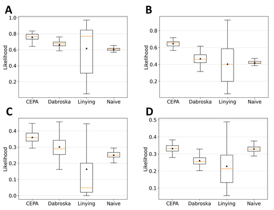 Figure 2 showcases the boxplot comparisons of the results across four estimation models based on different data generation distributions. From Figure 2A, it is observed that the CEPA model demonstrated the highest likelihood, 76%, for the uniform distribution. Furthermore, Figure 2B–D illustrate how CEPA outperformed the comparative models by margins of 65%, 36%, and 33% for the exponential, lognormal, and Clayton distributions, respectively. Additionally, while some models exhibited a performance that was only marginally better than the naive model, the model proposed in this study demonstrates similar or superior performance. These results highlight CEPA’s superior likelihood scores and stable performance across various distributions compared to the control groups.
