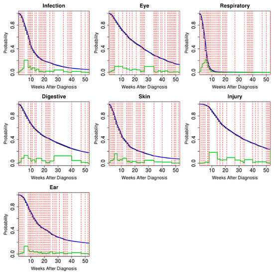 The univariate survival curves estimated by CEPA for the 9533 patients are plotted in Figure 3. These curves were consistent with Kaplan–Meier estimates [32,33]. According to the probability mass analysis conducted by CEPA, infectious, ear, respiratory, and skin diseases had high incidence rates in the early stages, and these rates decreased over time. However, digestive, eye, and injury diseases were evenly distributed over time. For respiratory diseases in the patient population, the probability of onset within 10 weeks was approximately 98%, with a very high initial incidence rate. The disease systems had extremely different censoring rates and median diagnosis times. As shown in Table 3 and Figure 3, respiratory diseases had an early onset and relatively low censoring rates compared with other diseases. The univariate survival curves estimated by CEPA for the observed 4343 patients are plotted in Supplementary Figure S1. These curves were also consistent with the Kaplan–Meier estimates. In the patient population without censored events, the initial incidence rates of infectious, respiratory, skin, injury, and ear diseases were high but decreased over time. Eye and digestive diseases were evenly distributed over time. Respiratory diseases with low censored rates are shown in Figure 3 and Supplementary Figure S1.