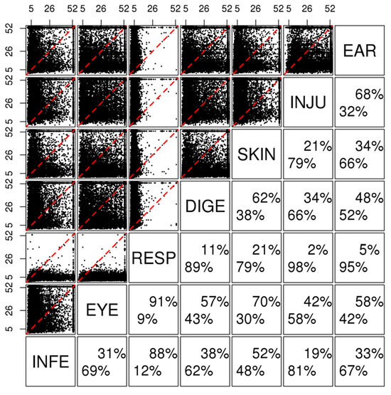 Pairwise precedence of the disease diagnosis events for the 9533 patients. The joint distribution of bivariate time-to-events was estimated by CEPA for each pair of events. The considered events were the diagnoses of infectious disease (INFE), eye disease (EYE), respiratory disease (RESP), digestive disease (DIGE), skin disease (SKIN), injury (INJU), and ear disease (EAR). Each top-left panel shows the observed or censored days of the bottom and right-side events. Each bottom-right panel shows the precedence chance of the top-side events to the left-side events (top-right %) and the opposite case (bottom-left %) when both events occurred at different times. For example, respiratory diseases preceded digestive diseases and were diagnosed 89% of the time.