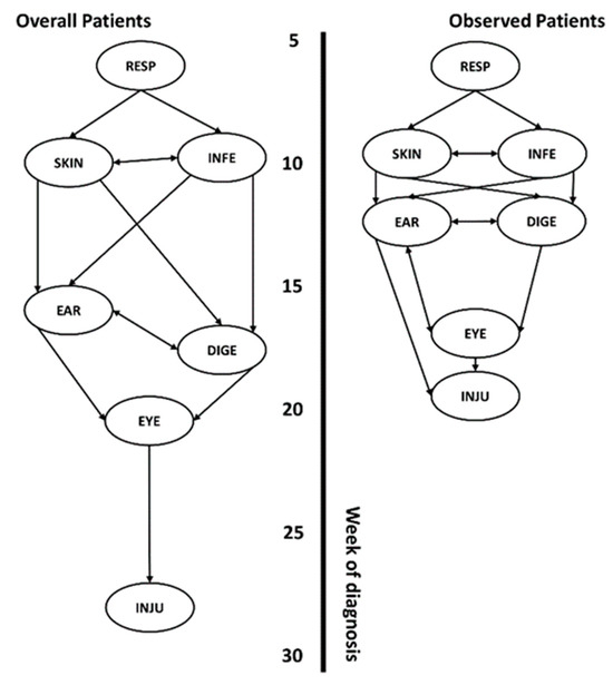 Figure 5 shows the diagnosis sequence network of the observed and overall patients based on the CEPA method results. Respiratory diseases occurred first, followed by skin and infectious diseases. The prior probabilities can be found in Figure 4 and Supplementary Figure S2. Skin and infectious diseases were expressed as bidirectional diseases because the preceding probability of skin diseases was 52%, which had no practical priority. For the ear, digestive, and eye disease networks, different patient populations exhibited different results. For the overall patients, ear and digestive diseases preceded eye diseases according to the valid sequence definition. The prior probability of ear and digestive diseases was 52%, expressed in both directions. For the observed patients, eye and ear diseases exhibited bidirectionality according to the valid sequence definition. Digestive diseases preceded eye diseases, and ear and digestive diseases were expressed in both directions with a 52% prior probability. Ear diseases preceded injury because there was a sequence in which injury occurred after ear diseases in the top five valid sequences (Supplementary Table S2).