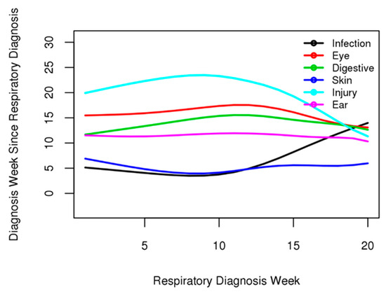 Figure 6 shows the period from the date of the respiratory disease diagnosis to the onset of infectious, eye, digestive, skin, ear, and injury diseases. Digestive, ear, and skin diseases were consistent, regardless of the time of the respiratory disease diagnosis. Within the wide range of the respiratory disease diagnosis times, spanning approximately 150 days, the digestive, ear, and skin disease onset gaps showed no strong increase or decrease from 2 to 3 weeks. Based on the consistency of the interval time, it was observed that digestive, ear, and skin diseases had a significant dependent relationship with respiratory diseases.