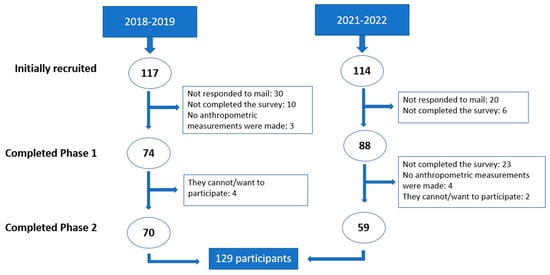 The sample, after eliminating those subjects who did not complete each of the phases of the study, consisted of a total of 129 students, 70 from the 2018/2019 academic year and 59 from the 2021/2022 academic year (Figure 1).