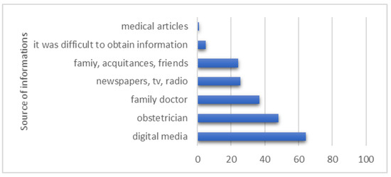The main source of information about SARS-CoV-2 for the participants was digital media (64.35%). Also, the obstetrician (47.95%) and the general doctor (36.91%) represented a source of information for women from our study about SARS-CoV-2 infection during pregnancy (Figure 1).