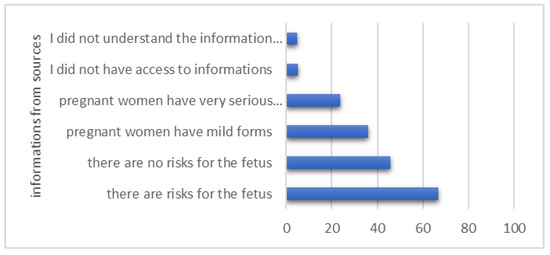 Participants declared, to a large extent (66.88%), that the medical information received from all sources suggested a presumed risk for the fetus in the case of infection with SARS-CoV-2 during pregnancy (Figure 2). Also, 23.66% reported fear of developing serious symptoms during COVID-19 disease, requiring hospitalization in the ICU (Figure 2).