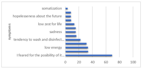 Among the symptoms included in the questionnaire for the assessment of stress during the pandemic, the most frequent was fear of the possibility of affecting the pregnancy (69.1%), followed by panic related to the unknown nature of the disease (33.8%), low energy (33.4%) and fear for the safety of one’s own life and relatives (31.2%); the rarest reported symptoms were somatization, loneliness and hopelessness about the future (Figure 3).