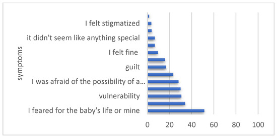 Among the symptoms included in the questionnaire for the assessment of stress during the SARS-CoV-2 disease, the most frequent was fear for one’s life or the baby’s life (51.4%), followed by anxiety (34.1%), vulnerability (30, 6%) and helplessness (30%); the rarest affective symptoms reported were the feeling of abandonment, the feeling of stigmatization and not accepting the diagnosis (Figure 4).