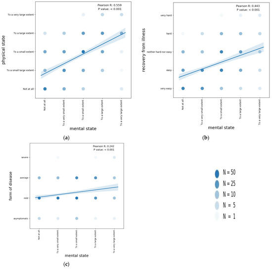 Correlations between mental state and physical state (a); Correlations between mental state and recovery from illness (b); Correlations between mental state and severity of COVID-19 disease (c).The intensity of the color is proportional to the number of patients who had the indicated pair of responses. The graph shows the linear regression line with the 95% confidence interval. Also, the Pearson coefficient and p-value of the correlation are indicated.