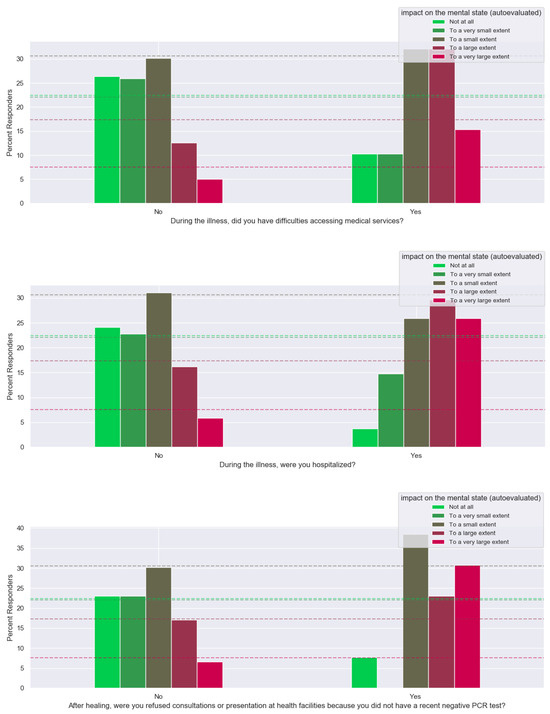 A number of 78 (25%) patients reported difficulty accessing medical services during the illness, and these patients evaluated their mental state significantly less favorably (47% of patients reported an altered state to a large or very large extent) compared with patients without difficulties in accessing medical services (only 18% of them reported an altered state to a large or very large extent) (Figure 6).