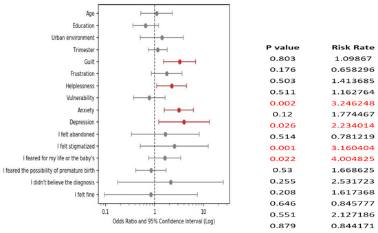 As stated before, among the symptoms included in the questionnaire for the assessment of stress during the SARS-CoV-2 disease, the most frequent was fear for one’s life or the baby’s life (51.4%), followed by anxiety (34.1%), vulnerability (30.6%) and helplessness (30%). Most patients presented between 0 and 6 stress symptoms (where the stress score is calculated as −1 for “my illness did not influence my perception of pregnancy”, “I did not believe in the diagnosis”, “I did not feel it seemed nothing special”, “I encountered no difficulties” and +1 for all other symptoms), and the number of symptoms reported was positively correlated with the impairment of the mental state (Pearson R = 0.57, p value < 0.001). In a multinomial logistic regression analysis, to determine the variables that increase the risk of falling into the categories of greatly and very greatly affected mental state after contact with SARS-CoV-2 disease, reporting depression increased the risk 4 times (p < 0.05), guilt 3.25 times (p < 0.01), anxiety 3.16 times (p < 0.01) and helplessness 2.23 times (p < 0.05), while the other stress symptoms were not independent risk factors with statistical significance (Figure 7).