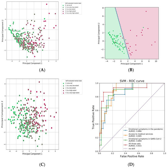 As can be seen in Figure 8D, the best separation was obtained using all three sets of questions, where cases with no mental state impairment could be identified with 91% accuracy and those with very high impairment with a precision of 86% (AUROC = 0.915). However, individual sets of questions also had good predictive value, with AUROC values of 0.866 for affective symptoms during the pandemic, AUROC of 0.894 for affective symptoms during SARS-CoV-2 infection, and AUROC of 0.903 for access to health care. In conclusion, both affective symptoms during pregnancy/pandemic, affective symptoms during SARS-CoV-2 disease and assessment of access to medical services were highly associated with the perception of mental state impairment, each of these sets of questions being sufficient to be able to discriminate with greater than 85% accuracy between extreme cases of mental impairment (not at all versus very much). Intermediate impairment cases formed intermediate clusters between these extremes, and their separation with good precision would not be possible even on the basis of all questions in the study (Figure 8C).