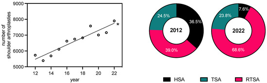 Linear regression analysis of primary osteoarthritis cases post-endoprosthesis per year for the period 2012–2022 (R2: 0.877; y = 227.6x + 2746; F: 64.11; *: slope of the line significantly different from zero, evidenced by an F-statistic, p < 0.0001). The data are categorized based on the type of endoprosthesis used (HSA, TSA, and RTSA) for the years 2012 and 2022.