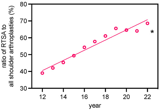 Linear regression analysis of the ratio of RTSA to all shoulder arthroplasties of primary osteoarthritis cases for the period 2012–2022 (R2: 0.9502; y =3.02x + 4.19; F: 171.80; *: slope of the line significantly different from zero, evidenced by an F-statistic, p < 0.0001).