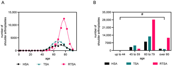 Figure (A) presents a Gaussian regression analysis of all cases of primary osteoarthritis following shoulder arthroplasty from 2012 to 2022. The data are categorized based on the type of arthroplasty used and the patient’s age. The calculated mean age and standard deviation (SD) were for the hemiprosthesis, 68.8 ± 12.0 years; for the total shoulder arthroplasty, 67.0 ± 10.3 years; and for the reverse shoulder arthroplasty, 76.8 ± 12.0 years. Figure (B) presents categorized data for all cases of primary osteoarthrosis following endoprosthesis implantation from 2012 to 2022. The data are grouped based on the type of endoprosthesis used and the patient’s age. Data for the “up to 44 years” age group: 144 HSA; 142 TSA; and 9 RTSA (values too low to be visualized effectively). # Chi-squared test; p < 0.0001, indicating a statistically significant association between patient age groups and the types of endoprosthesis used.
