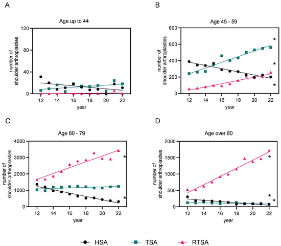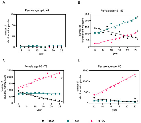 Linear regression analysis of primary osteoarthritis cases post-endoprosthesis in females, 2012–2022. The data are categorized based on the type of endoprosthesis used (HSA, TSA, and RTSA) and patient age groups ((A): “<44” years, (B): “45–59” years, (C): “60–79” years, and (D): “>80” years of age). Refer to Supp. Table S3 for detailed regression analysis parameters. The level of significance is shown in Supp. Table S3 (* p-value < 0.05), indicating if each slope is significantly non-zero.