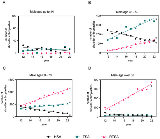 Linear regression analysis of primary osteoarthritis cases post-endoprosthesis in males, 2012–2022. The data are categorized based on the type of endoprosthesis used (HSA, TSA, and RTSA) and patient age groups ((A): “<44” years, (B): “45–59” years, (C): “60–79” years, and (D): “>80” years of age). Refer to Supp. Table S1 for detailed regression analysis parameters. The level of significance is shown in Supp. Table S2 (* p-value < 0.05), indicating if each slope is significantly non-zero.
