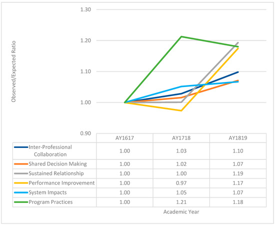 Figure 3 represents the change from the base year in the observed to expected ratios by profession, which were standardized by site. Interprofessional collaboration improved over time as follows: 17% for AY17-18 and 35% for AY18-19 for physician residents. For nurse practitioner HPTs, interprofessional collaboration was lower (−11% for AY17-18 and −4% for AY18-19). For associated health HPTs, interprofessional collaboration was lower (−11%) for AY17-18, but improved by 9% for AY18-19.