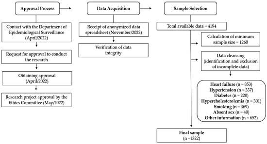 According to the ESD, there were 4194 medical records available for consultation. However, during data screening, many incomplete medical records were observed, prompting the need for a minimum sample estimate, which would enable the exclusion of incomplete medical records, eliminating the need for weighting procedures. For this, an estimated prevalence of 50% (for unknown outcomes), a confidence interval of 95%, a tolerable error of 4 percentage points, and a design effect (deff) set at 2 (multiplier factor) were considered. Additionally, 20% was added to mitigate losses. Based on these parameters, a minimum of 1260 complete records was necessary. Despite the many incomplete pieces of information, partly attributed to not all data being entered into the ESD system, the final sample remained robust, totaling 1322 older adults.