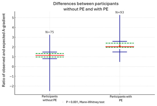 For further analysis, we calculated the ratio of expected and observed A-a values to quantify how much each patient differed from the expected value. Using a continuous outcome (ratio of expected and observed A-a values) instead of a binary one (normal vs. abnormal A-a value) allows for broader statistical analysis. After separating the total sample of participants based on the presence or absence of PE, it was shown that the group with PE had a significantly higher median ratio of expected and observed A-a values (2.14 vs. 1.18,