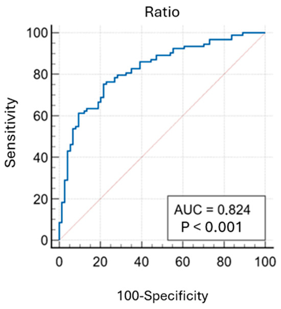 When we applied our data to logistic regression models with the ratio of expected and observed A-a values as the independent variable, the analysis resulted in a model with an AUC value of 0.824 (