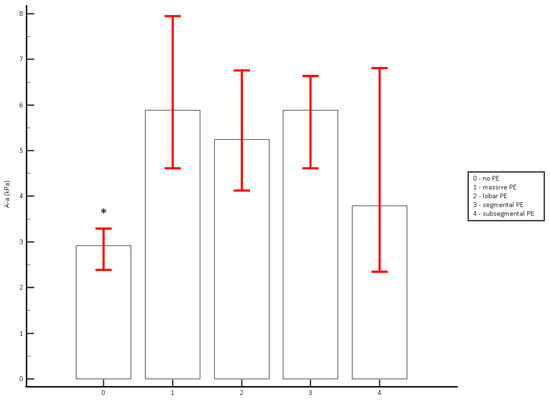 Figure 4). Median A-a gradient values and interquartile ranges for each thrombus burden group were as follows: no embolism (median 2.919, IQR 1.850–3.612), massive embolism (median 5.882, IQR 4.561–8.086), lobar embolism (median 5.244, IQR 3.600–7.032), segmental embolism (median 5.887, IQR 4.409–7.214), and subsegmental embolism (median 3.790, IQR 3.550–6.138). While variations in median A-a gradient values were observed among the massive, lobar, segmental, and subsegmental embolism groups, statistical analysis revealed no significant differences between these categories of PE. Post-hoc Dunn analysis confirmed that the A-a gradient values in the massive, lobar, segmental, and subsegmental embolism groups were significantly higher than in the no-embolism group (