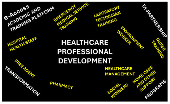 Figure 4. The actual development is carried out by the academic and training institutions through a cloud of an ecosystem made of public telecommunication infrastructures and IoT-enabled devices, where a healthcare professional, in accordance with the registration program, accesses online classes using healthcare institution credentials (