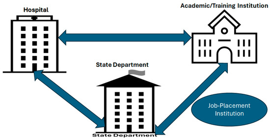 For the excellent implementation of the CPD, active collaboration among the health institution, the academic or training institution, and the state institutions is required. This partnership is crucial: the state defines curricula, which are further developed by the university, and presented to the healthcare institution and the population in large. The university develops tailored-made programs that enhance skills among healthcare professionals. While health institution staff members get registered through an internal fair assessment, the population can only access the learning/training program through a competitive entrance examination based on excellence and transformation predispositions organized by the State Department. People from poor backgrounds access the NSFAS, high-income learners afford half (for example) of the fees, and healthcare-established professionals pay the totality, assuming the support of their institution. The State Department defines the medical standards and protocol, as well as the prerequisites to be eligible for learning, which are further applied by healthcare institutions. Healthcare institutions develop their staff but can also source talent from academic/training institutions, as well as from job-placement institutions, provided that the candidates fulfill the requirements. Job placements are mentioned here since there will be demand from smaller healthcare institutions like private practices and continuous replacement in bigger institutions.